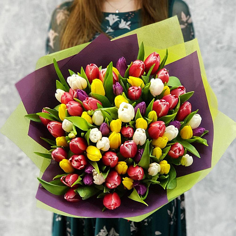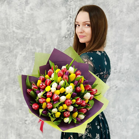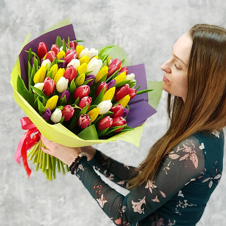 Букет из разноцветных тюльпанов в стильной упаковке — отличный выбор для подарка! На сайте вы найдете красочные фотографии, которые помогут сделать выбор. Цена букета — 7600 руб.