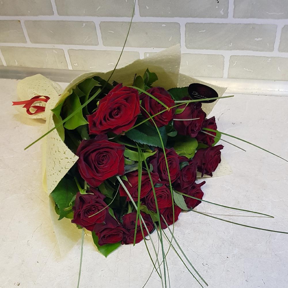 Состав: розы красные 50 см - 15 шт.; Салал пучок - 7 шт.; белграсс - 10 шт.; Фетр 3d - 2 шт.; Лента - 1 шт.