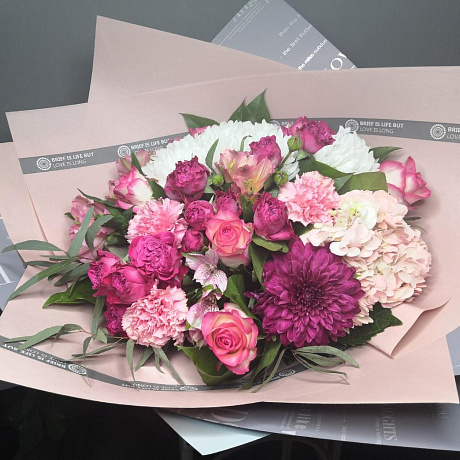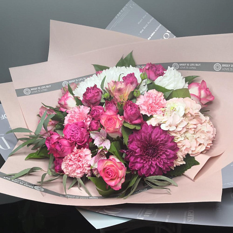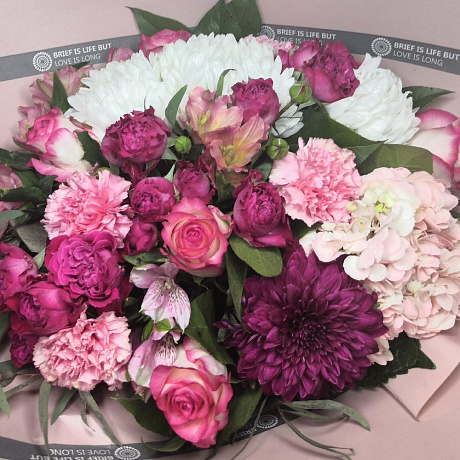 На фото - Букет цветов "Романтика" №165. В составе данной композиции: Гортензия - 1 шт.; Хризантема - 3 шт.; Роза кустовая - 4 шт.; Роза - 7 шт.; Альстромерия Микс Европа - 4 шт.; Гвоздика сортовая - 3 шт.; Эвкалипт - 3 шт.; Салал - 9 шт.; Пленка дизайнерская - 4 шт.; Лента атласная - 2 шт..