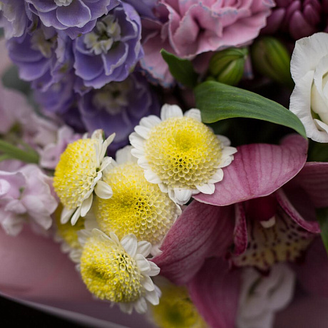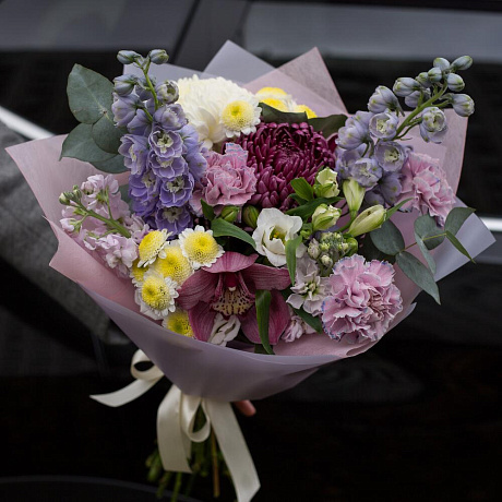 Закажите Букет с дельфиниумом и хризантемой Бигуди Перпл №2 с доставкой в Москве и МО.
