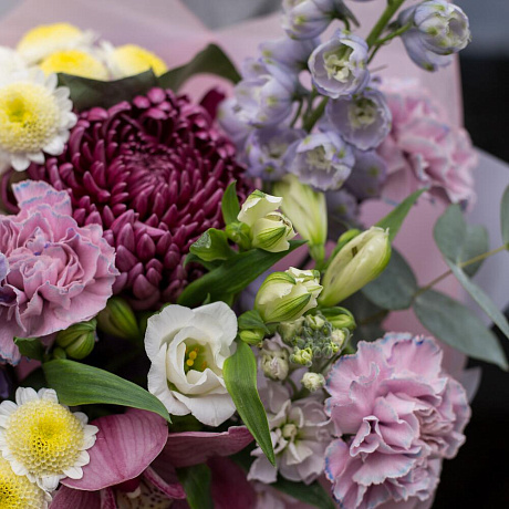 Букет с дельфиниумом и хризантемой Бигуди Перпл №2