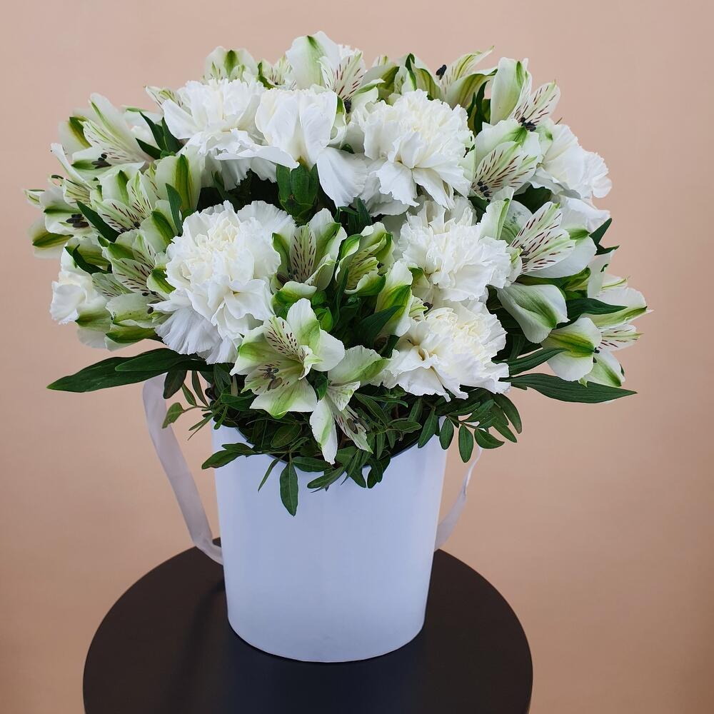На фото - Букет в коробке №163. В составе данной композиции: Диантус - 11 шт.; Альстромерия - 10 шт..