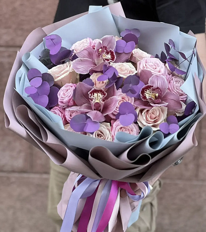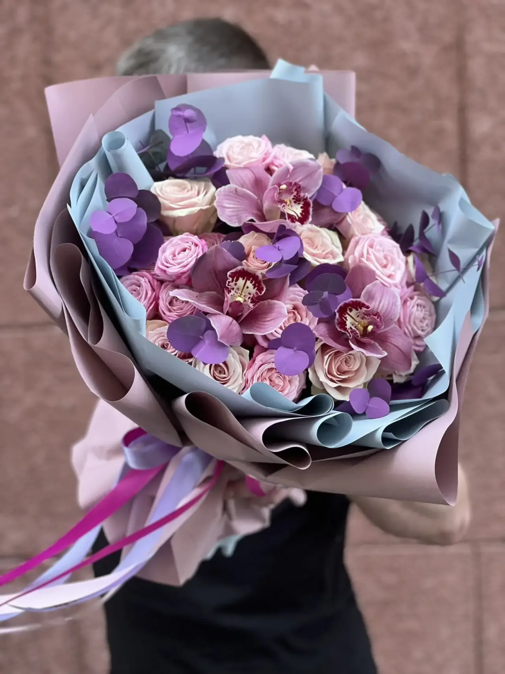 На фото - Букет цветов "Волшебство цвета". В составе данной композиции: Кения - 10, роза кустовая - 5, орхидея - 3, эвкалипт 0,1.