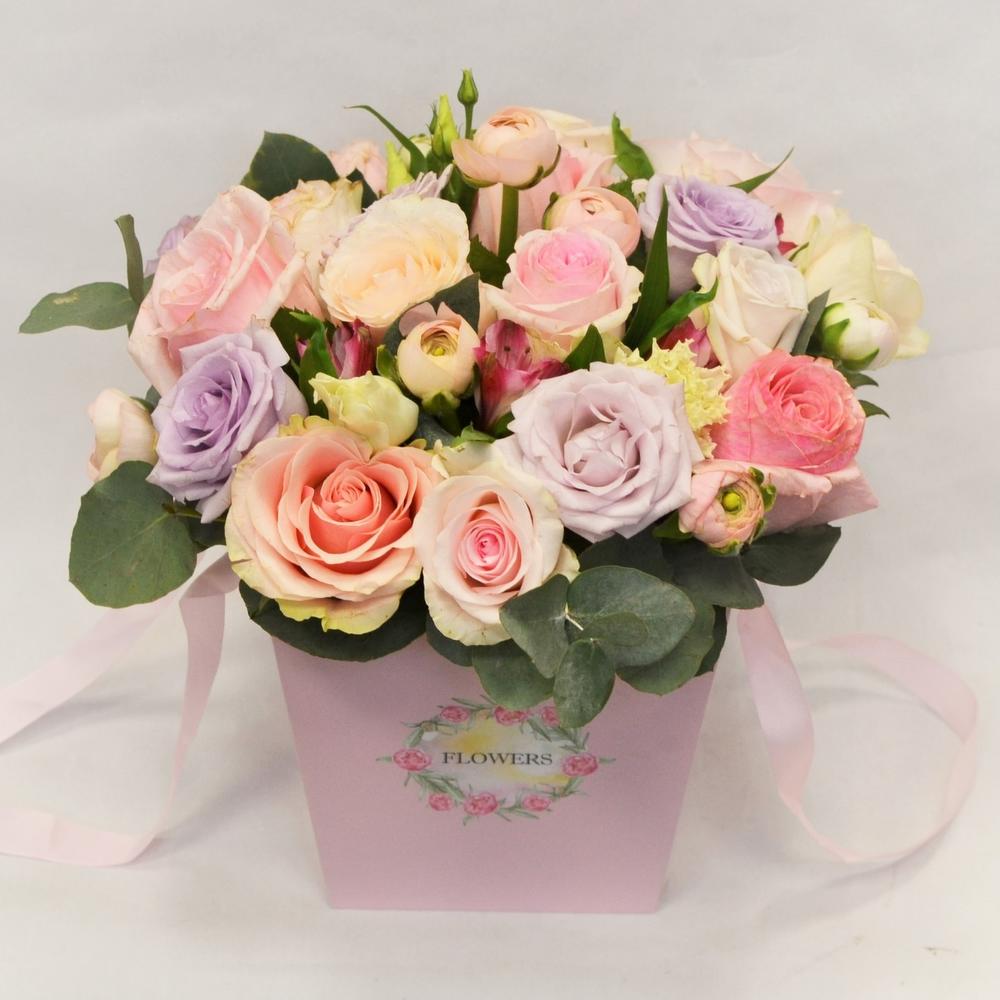 Состав: розы микс - 14 шт.; Роза кустовая - 2 шт.; Альстромерия - 2 шт.; Лизиантус - 2 шт.; Эвкалипт - 3 шт.; Коробка - 1 шт.; Оазис флористический - 1 шт.
