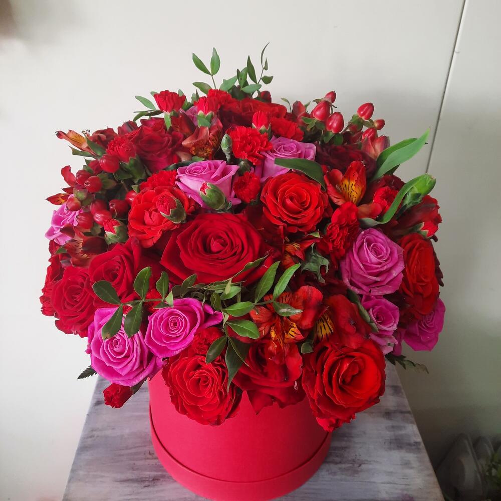 На фото - Цветы в коробке №364. В составе данной композиции: розы - 45 шт.; Гиперикум - 2 шт.; Альстромерия - 7 шт.; Писташ - 3 шт.; Коробка шляпная - 1 шт.; Оазис флористический - 1 шт..