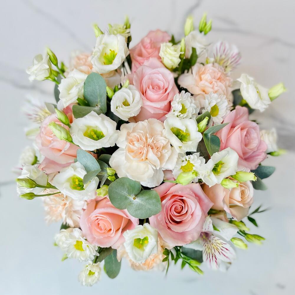 На фото - Цветы в коробке №825. В составе данной композиции: Роза - 7 шт.; Гвоздика - 5 шт.; Лизиантус - 5 шт.; Альстромерия - 1 шт.; Сантини - 1 шт.; Эвкалипт - 1 шт.; Писташ - 1 шт.; Коробка - 1 шт..