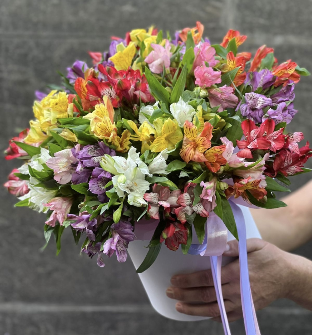 На фото - Цветы в коробке «Брызги фонтана». В составе данной композиции: Альстромерия Микс Европа - 25 шт.; коробка - 1 шт.; Оазис - 1 шт..
