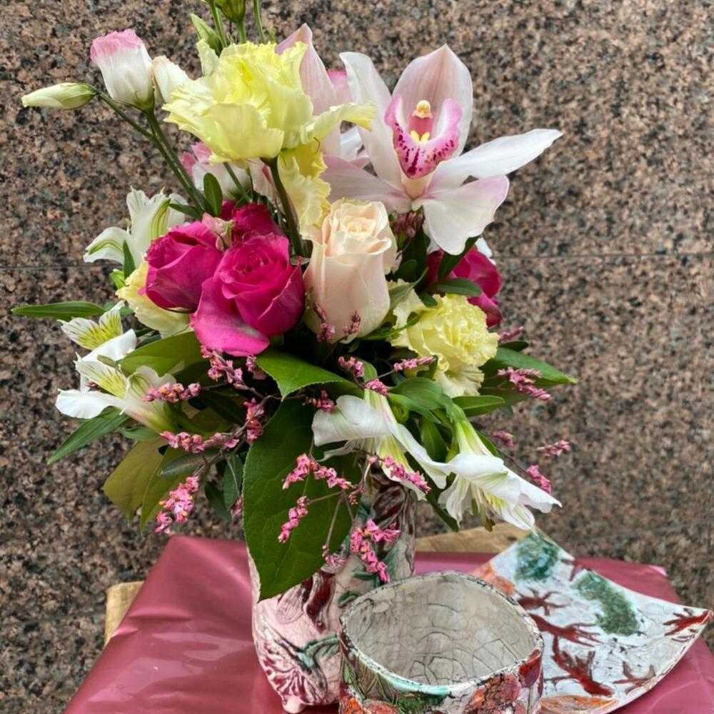 На фото - Композиция цветов в авторской вазе из керамики. В составе данной композиции: Роза одноголовая - 2 шт.; Роза кустовая - 1 шт.; Альстромерия - 1 шт.; Орхидея Цимбидиум - 3 шт.; Эустома - 1 шт.; Писташ - 2 шт.; ваза из керамики - 1 шт..