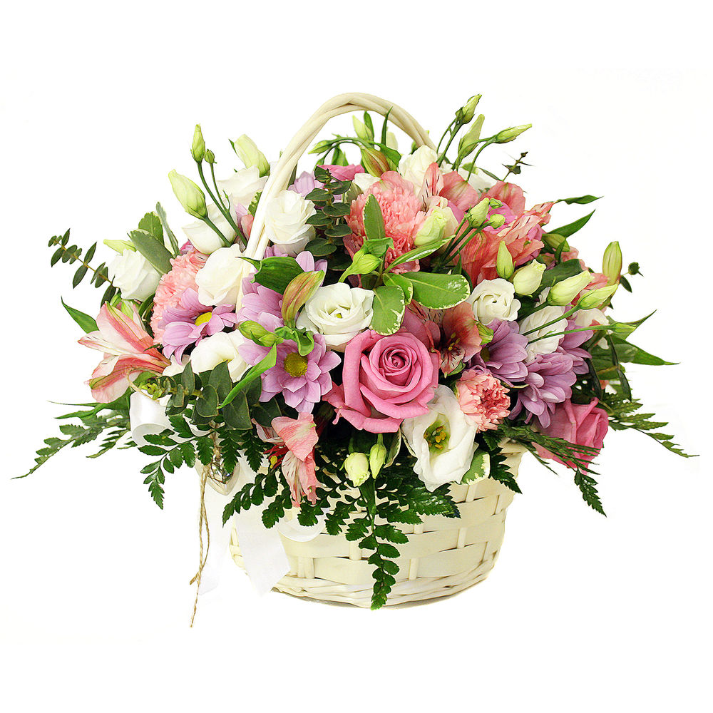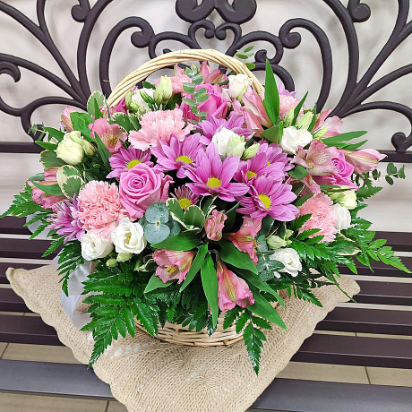 На фото - Корзина "Розовый нектар". В составе данной композиции: Роза аква - 5 шт.; Альстромерия - 5 шт.; Хризантема кустовая - 3 шт.; Лизиантус - 6 шт.; Гвоздика - 7 шт.; Эвкалипт - 2 шт.; Зелень - 1 шт.; Корзина - 1 шт..