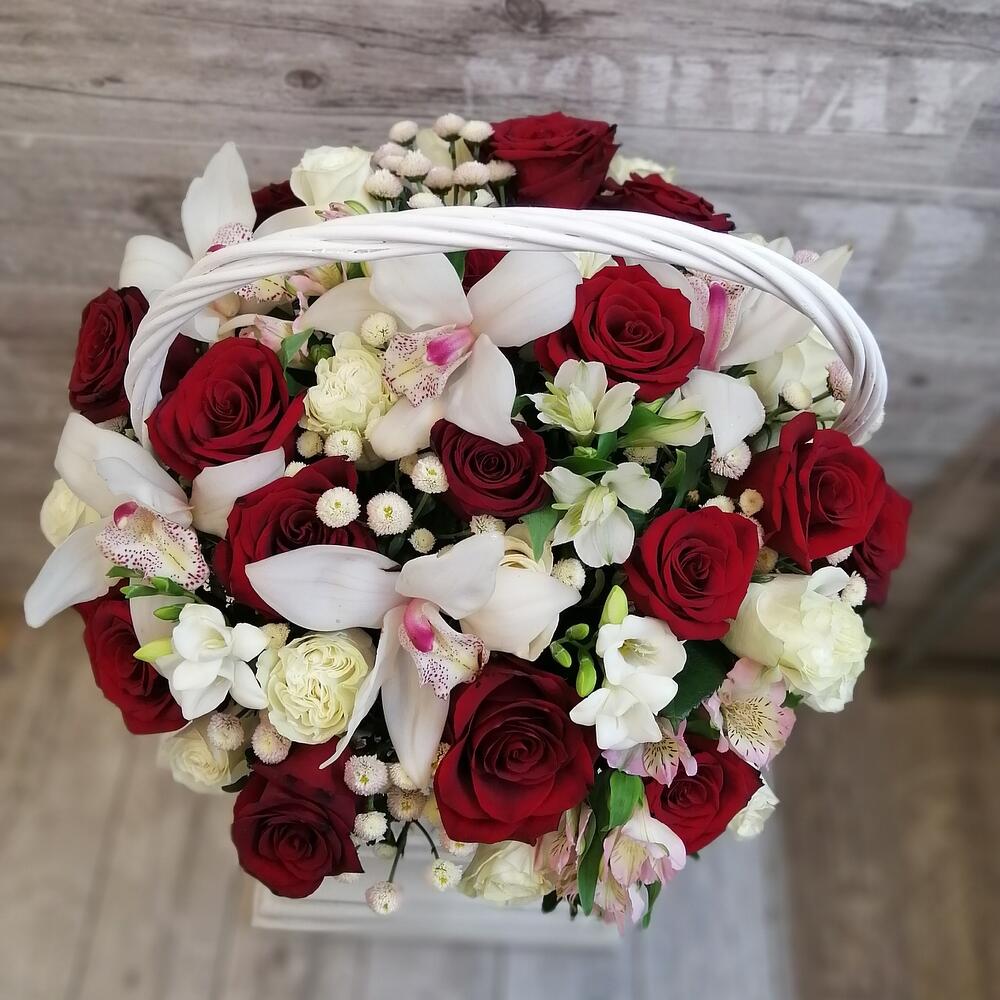 На фото - Корзина с цветами №171. В составе данной композиции: Корзина плетеная - 1 шт.; Оазис флористический - 1 шт.; Роза Эквадор - 25 шт.; Орхидея Цимбидиум - 5 шт.; Альстромерия Микс Европа - 3 шт.; Фрезия белая - 2 шт.; сантин белая - 7 шт.; Пистация - 1 шт..