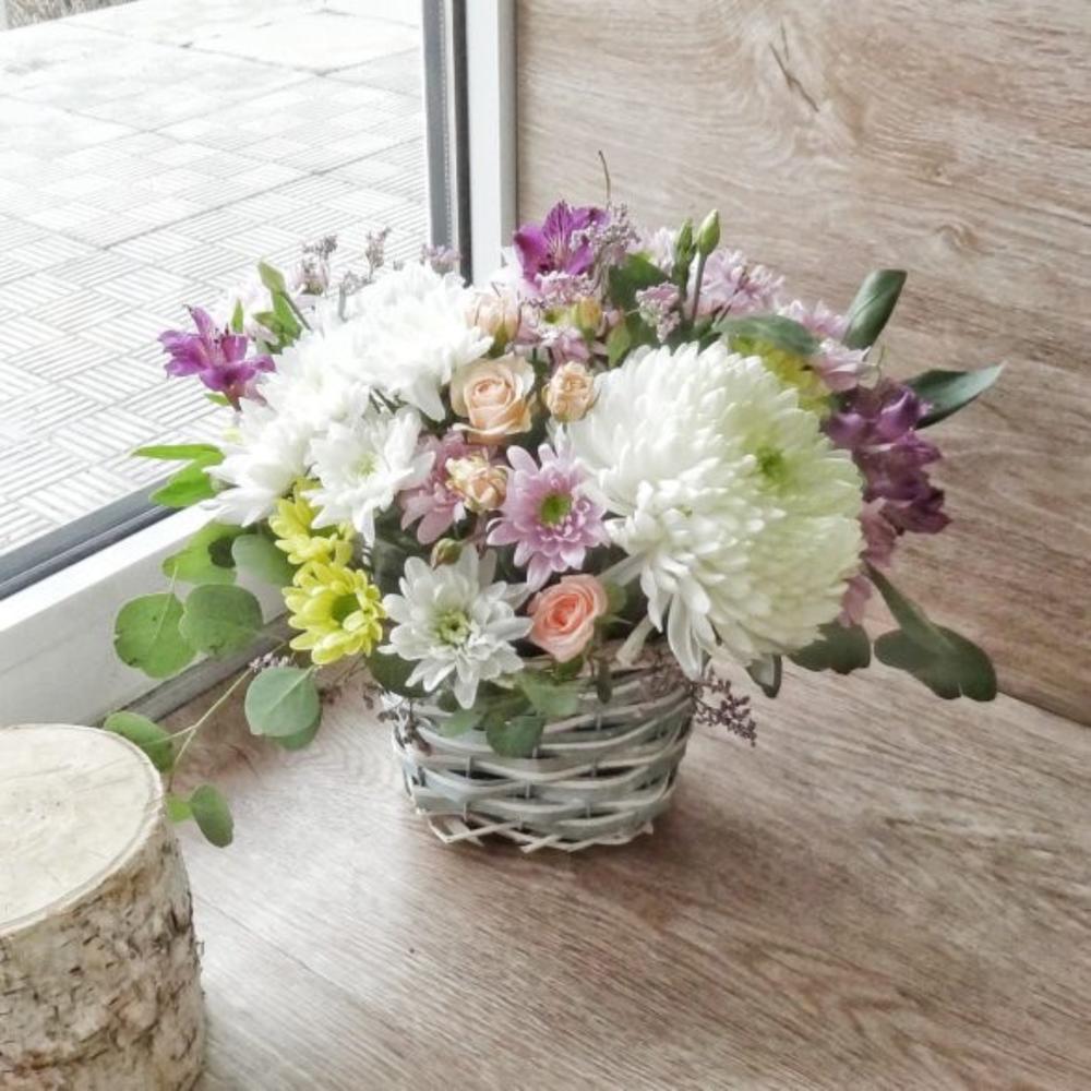 На фото - Корзинка цветов «Мисье». В составе данной композиции: Хризантема одноголовая - 1 шт.; Хризантема кустовая - 2 шт.; Альстромерия - 2 шт.; зелень декоративная - 1 шт.; Оазис - 1 шт.; Корзина - 1 шт.; Роза кустовая - 2 шт..