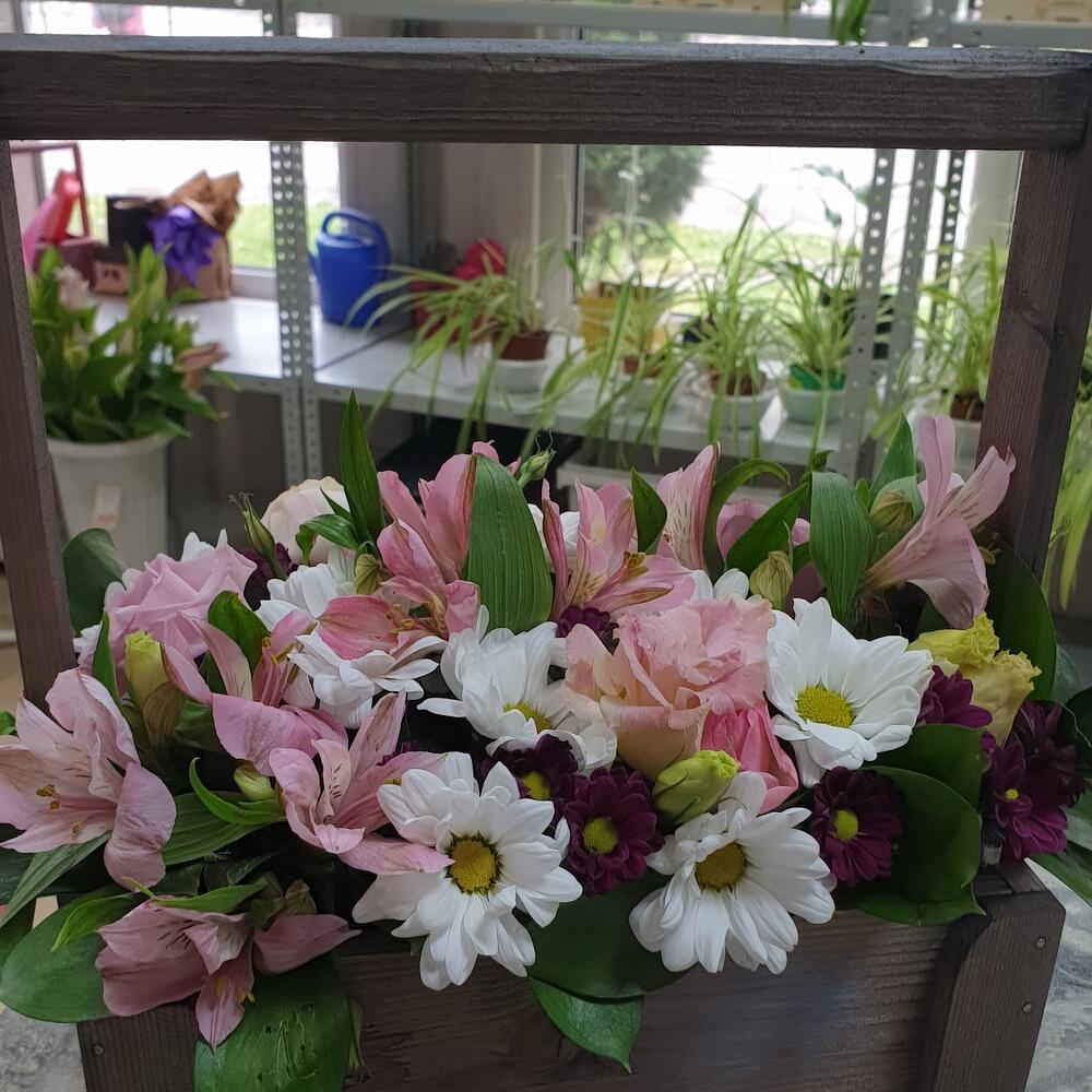 На фото - Ящик с цветами "Дыхание утра". В составе данной композиции: Ящик деревянный - 1 шт.; Оазис флористический - 1 шт.; Рускус - 3 шт.; Сантини - 2 шт.; Хризантема кустовая - 1 шт.; Альстромерия Микс Европа - 3 шт.; Лизиантус - 1 шт..