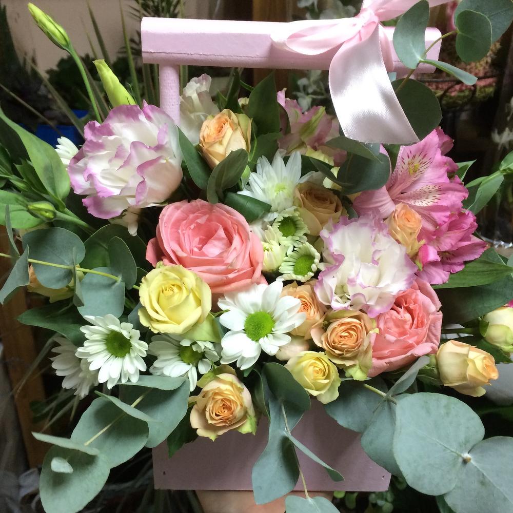 На фото - Ящик с цветами «Розмарин». В составе данной композиции: Ящик деревянный - 1 шт.; Роза - 3 шт.; Кустовая роза - 4 шт.; Альстромерия - 2 шт.; эустома розовая - 2 шт.; Эвкалипт Микс - 1 шт.; Рускус - 4 шт..