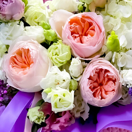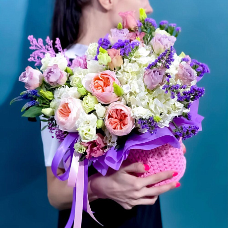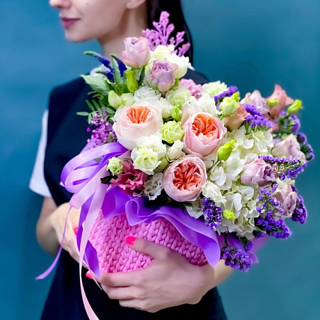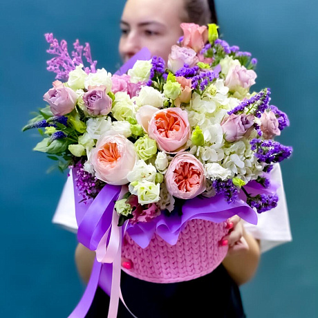 На фото - Букет "Джульетта PRO". В составе данной композиции: Роза Джульетта - 3 шт.; Гортензия - 1 шт.; Эустома - 4 шт.; Солидаго - 1 шт.; Статица - 2 шт.; Вероника - 1 шт.; Диантус кустовой - 3 шт.; Фисташка - 10 шт.; Лента - 2 шт.; Пленка матовая - 1 шт.; вязаная коробка ручной работы - 1 шт..