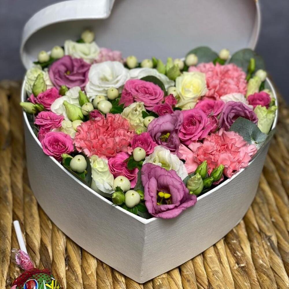 На фото - Букет цветов №373. В составе данной композиции: Роза кустовая - 4 шт.; Эустома - 5 шт.; Гвоздика - 3 шт.; Гиперикум - 3 шт.; Эвкалипт - 2 шт.; Оазис флористический - 2 шт.; Коробка - 1 шт..