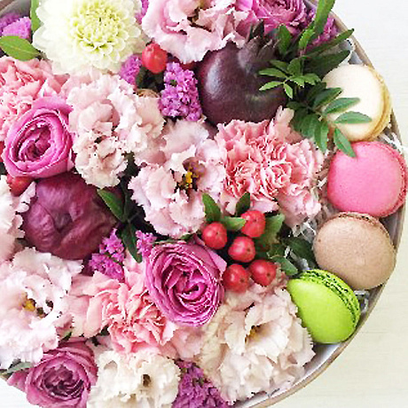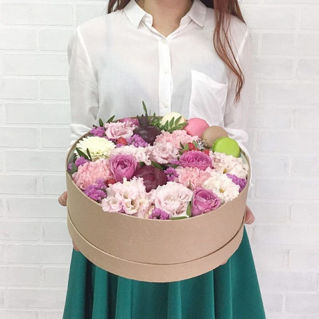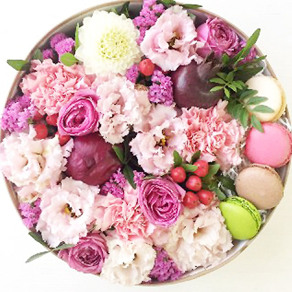 Состав: Роза - 5 шт.; Диантус - 3 шт.; Эустома - 6 шт.; Зелень - 1 шт.; Макарон - 4 шт.