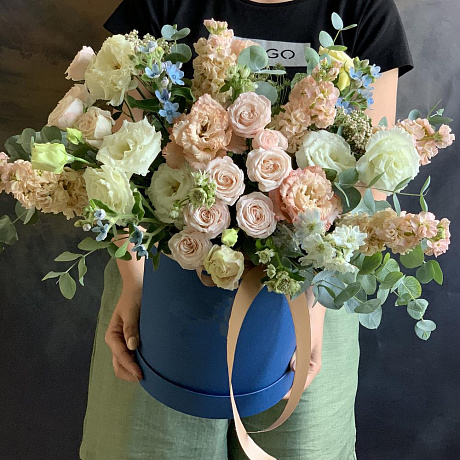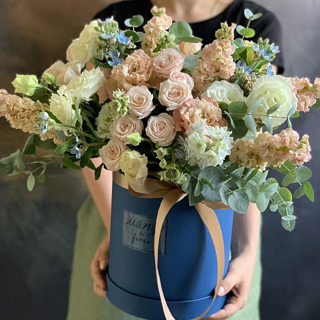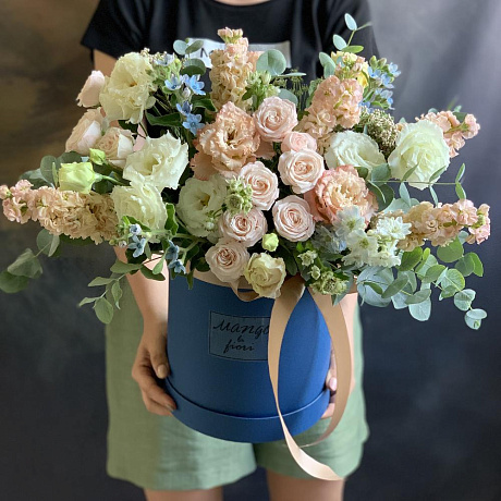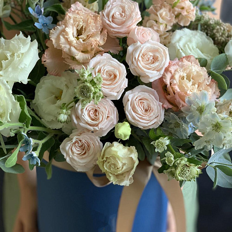 На фото - Букет цветов "Волшебные истории". В составе данной композиции: Эустома - 6 шт.; Дельфиниум - 1 шт.; Роза кустовая - 5 шт.; Озотамнус - 1 шт.; Маттиола - 5 шт.; Оксипеталум - 3 шт.; Астранция - 2 шт.; Писташ - 5 шт.; Эвкалипт - 6 шт.; Коробка большая - 1 шт..