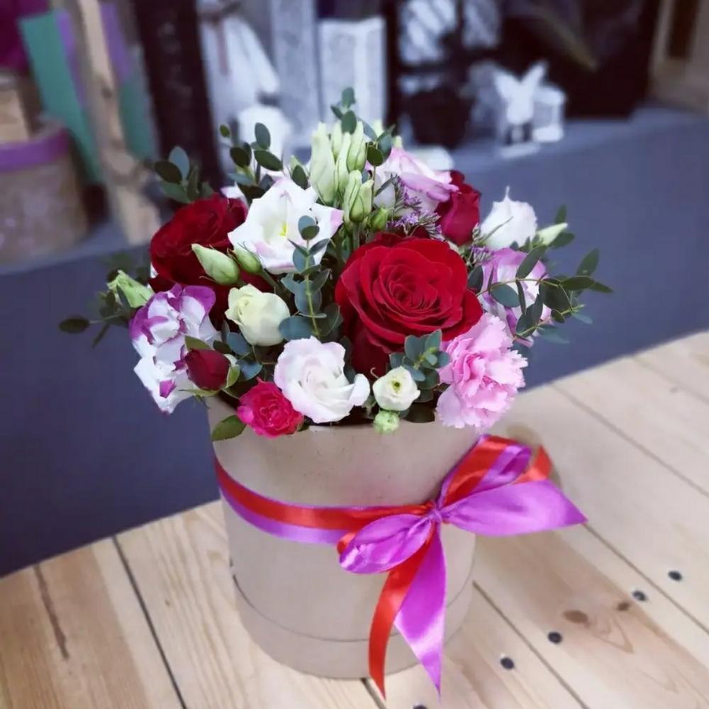 На фото - Цветы в коробке (роза ред наоми. - 3 шт.). В составе данной композиции: роза ред наоми. - 3 шт.; Эустома - 3 шт.; Эвкалипт - 2 шт.; Писташ - 3 шт.; Коробка - 1 шт.; Оазис флористический - 1 шт..