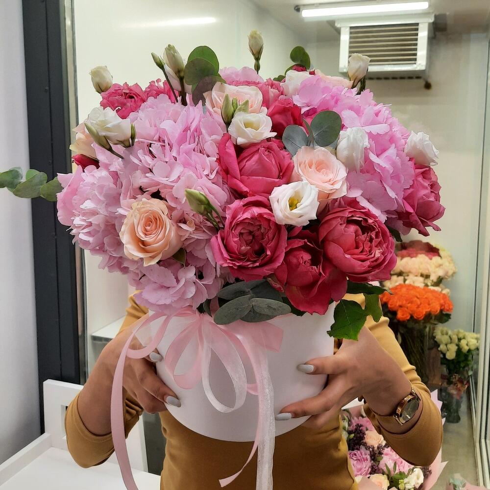 <p>На фото - Цветы в коробке №549. В составе данной композиции: Гортензия розовая - 3 шт.; Misty Bubbles пионовидная роза - 5 шт.; Роза - 6 шт.; эустома белая - 3 шт.; Эвкалипт - 1 шт.; Шляпная коробка - 1 шт..</p> <p>На сайте "Доступная доставка цветов" Вы найдете большой выбор недорогих букетов, цветочных композиций для любого повода.</p> <p>У нас можно заказать Цветы в коробке №549 с доставкой по Москве.</p>