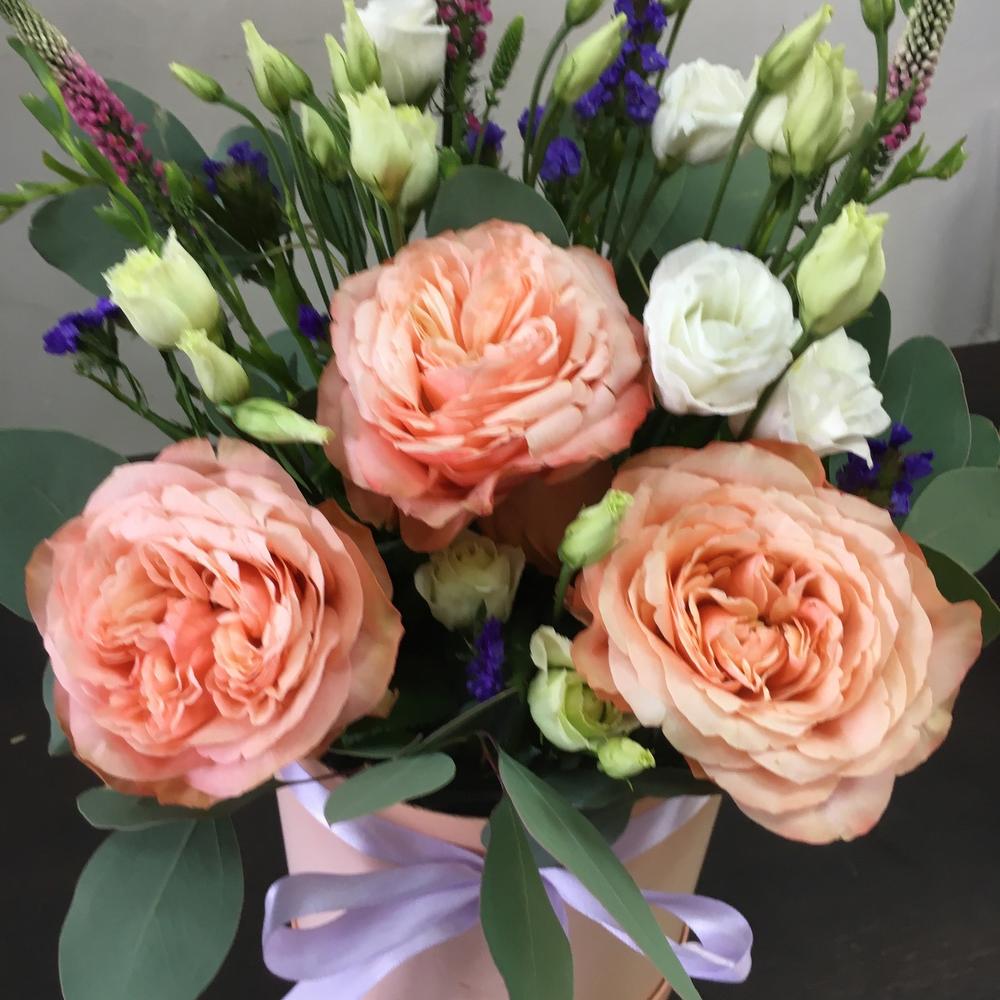На фото - Цветы в коробке №606. В составе данной композиции: Роза пионовидная кахала - 3 шт.; Писташ - 2 шт.; Эвкалипт - 7 шт.; Статица синяя - 2 шт.; Вероника синяя - 3 шт.; эустома белая - 3 шт.; Коробка шляпная - 1 шт.; Оазис флористический - 1 шт.; Лента атласная - 1 шт..