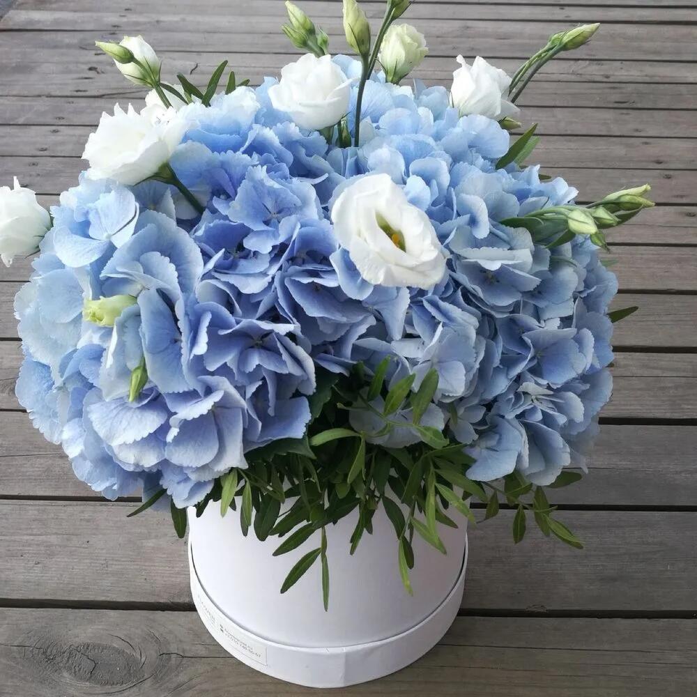 На фото - Цветы в коробке №620. В составе данной композиции: гортензия премиум - 3 шт.; Фисташка - 4 шт.; Оазис флористический - 1 шт.; Коробка шляпная - 1 шт.; Эустома - 3 шт..