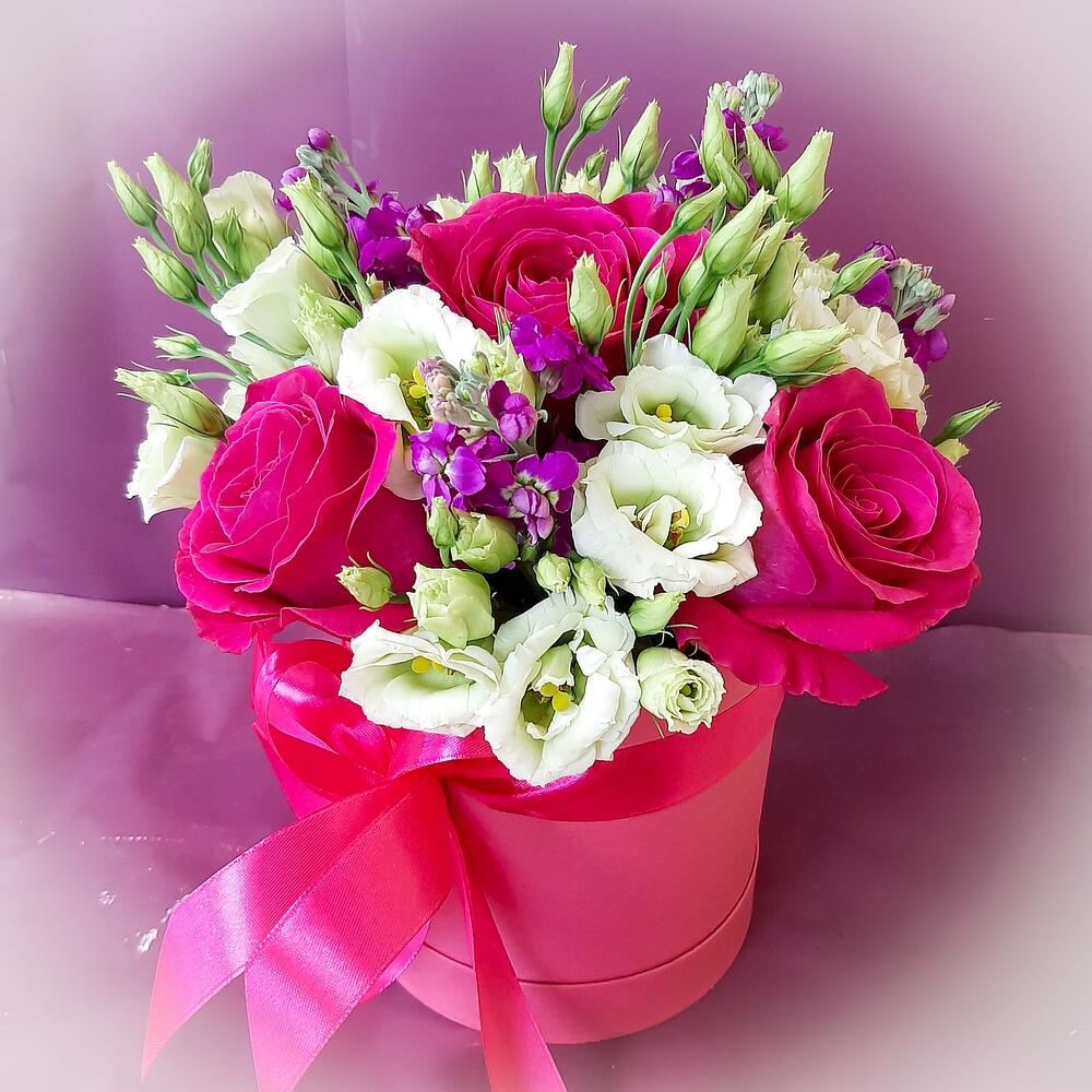 На фото - Цветы в коробке №690. В составе данной композиции: Роза - 3 шт.; Маттиола - 5 шт.; Эустома - 5 шт.; Коробка шляпная - 1 шт.; Фисташка - 5 шт.; Оазис флористический - 1 шт.; Лента атласная - 2 шт..