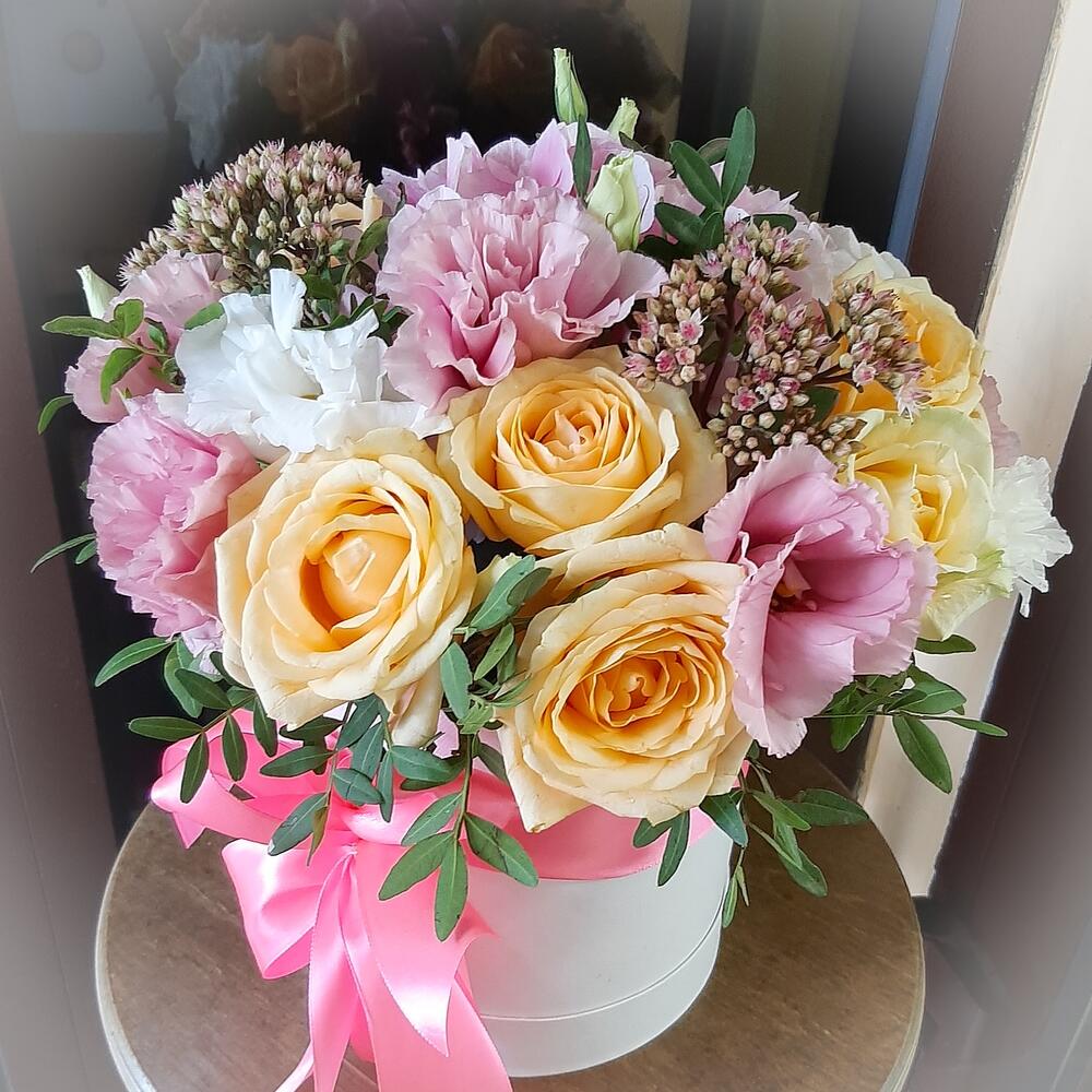 На фото - Цветы в коробке №738. В составе данной композиции: Роза - 7 шт.; Трахелиум - 3 шт.; Эустома - 4 шт.; Фисташка - 3 шт.; Коробка шляпная - 1 шт.; Оазис флористический - 1 шт.; Лента атласная - 2 шт..