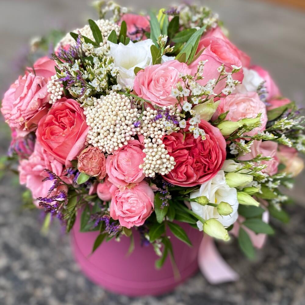 На фото - Цветы в коробке №908. В составе данной композиции: Роза пионовидная - 9 шт.; Лимониум - 4 шт.; Мадам бомбастик - 5 шт.; эустома белая - 2 шт.; Озотамнус - 1 шт.; Лента атласная - 1 шт.; Флористическая губка - 1 шт.; Коробка шляпная - 1 шт..