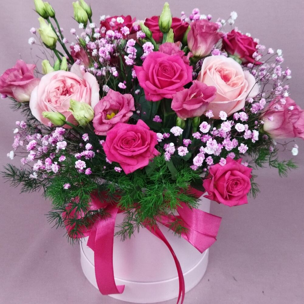 На фото - Цветы в коробке №955. В составе данной композиции: Шляпная коробка - 1 шт.; Оазис флористический - 1 шт.; Лента атласная - 1 шт.; Аспарагус - 3 шт.; Роза пионовидная - 3 шт.; Эустома - 2 шт.; Роза кустовая - 2 шт..