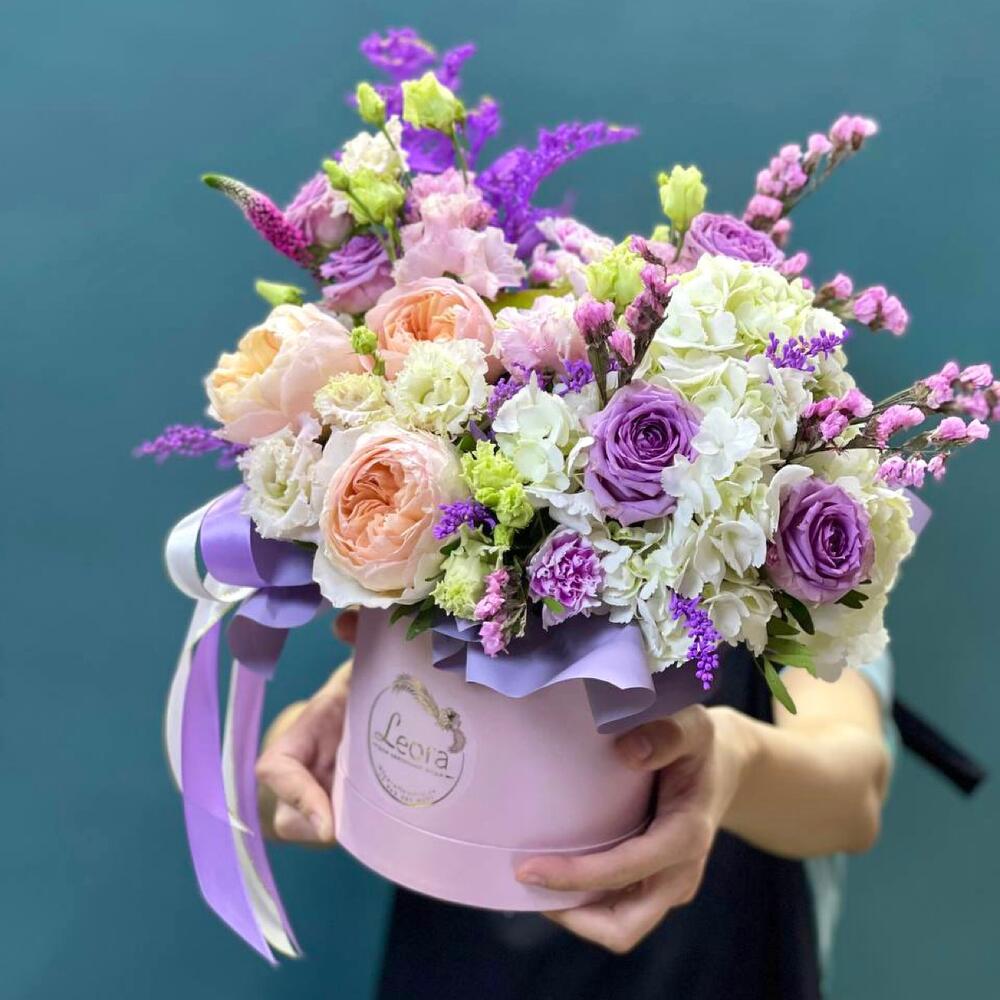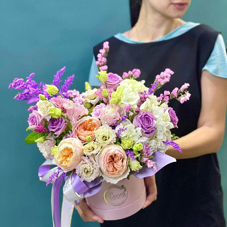 На фото - Букет цветов "Джульетта New" №160. В составе данной композиции: Роза Джульетта - 3 шт.; Роза - 5 шт.; Гортензия - 1 шт.; Вероника - 1 шт.; Солидаго - 1 шт.; Статица - 2 шт.; Эустома - 2 шт.; Диантус кустовой - 3 шт.; Фисташка - 5 шт.; Шляпная коробка - 1 шт.; Оазис флористический - 1 шт.; Пленка матовая - 1 шт.; Лента - 2 шт..