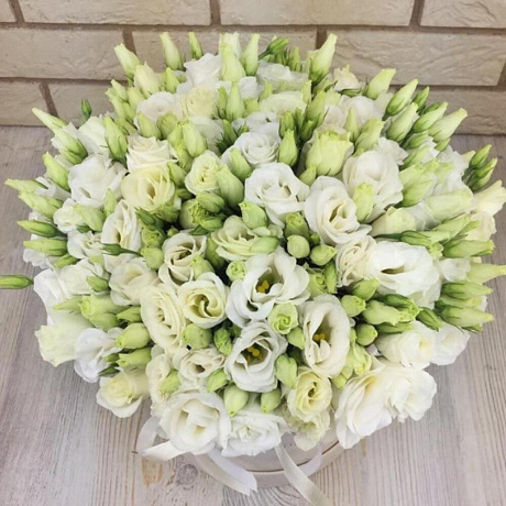 На фото - Белая эустома в коробке №162. В составе данной композиции: эустома белая - 31 шт.; Коробка шляпная - 1 шт.; Губка флористическая - 1 шт..