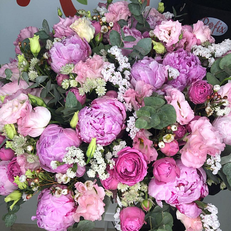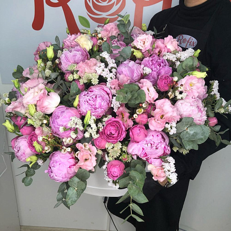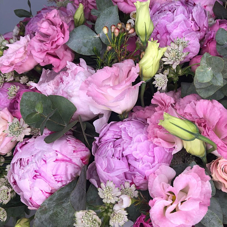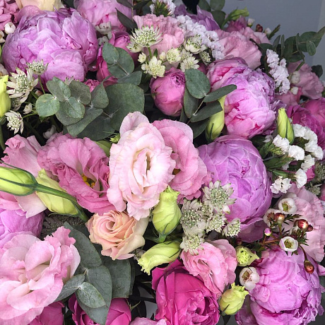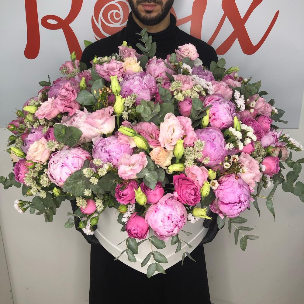 На фото - Композиция цветочная «Love». В составе данной композиции: Пион Сара Бернар - 21 шт.; роза кустовая пионовидная misty bubbles - 20 шт.; Ваксфлауэр белый - 15 шт.; Эвкалипт - 20 шт.; Астранция - 19 шт.; Эустома алиса - 30 шт.; Статица - 19 шт.; Оазис флористический - 3 шт.; Коробка сердце - 1 шт..