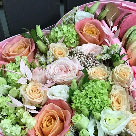 На фото - Коробка цветов сердце Карамель. В составе данной композиции: Коробка сердце - 1 шт.; Оазис флористический - 1 шт.; Лента атласная - 1 шт.; Озотамнус - 2 шт.; макарон (пирожное) - 7 шт.; Лимониум МИКС - 1 шт.; Роза кустовая - 4 шт.; Эустома - 1 шт.; Вибурнум - 1 шт.; Роза Мисс Пигги - 3 шт..