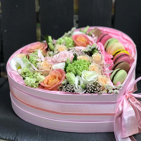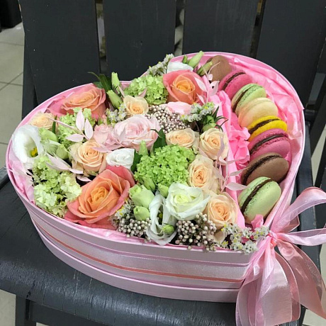 <p>На фото - Коробка цветов сердце Карамель. В составе данной композиции: Коробка сердце - 1 шт.; Оазис флористический - 1 шт.; Лента атласная - 1 шт.; Озотамнус - 2 шт.; макарон (пирожное) - 7 шт.; Лимониум МИКС - 1 шт.; Роза кустовая - 4 шт.; Эустома - 1 шт.; Вибурнум - 1 шт.; Роза Мисс Пигги - 3 шт..</p> <p>На сайте "Доступная доставка цветов" Вы найдете большой выбор недорогих букетов, цветочных композиций для любого повода.</p> <p>У нас можно заказать Коробка цветов сердце Карамель с доставкой по Москве.</p>
