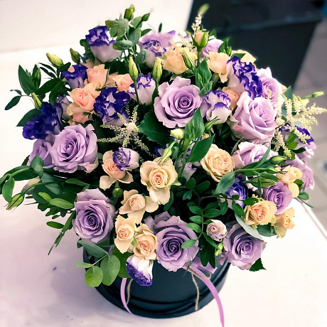 На фото - Коробка цветов «Сиреневые мечты». В составе данной композиции: Коробка шляпная - 1 шт.; Оазис флористический - 1 шт.; Лента - 1 шт.; Кустовая роза - 6 шт.; эустома фиолетовая - 9 шт.; Роза - 15 шт.; Зелень - 7 шт.; Астильба - 3 шт..