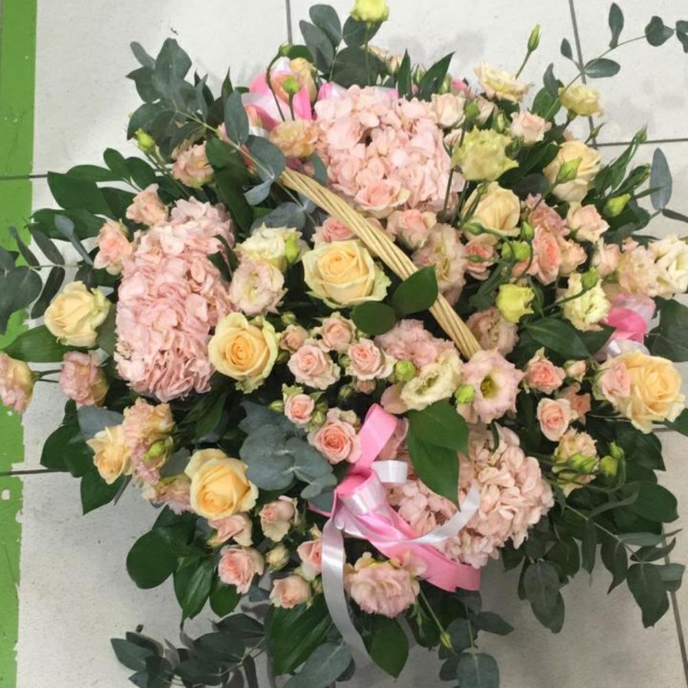 На фото - Корзина с цветами №219. В составе данной композиции: Роза кустовая - 10 шт.; роза пич аваланж - 10 шт.; Гортензия розовая - 3 шт.; Эустома - 10 шт.; Эвкалипт - 10 шт.; Рускус сочи - 30 шт.; Лента атласная - 6 шт.; Корзина плетеная - 1 шт.; Оазис флористический - 2 шт..