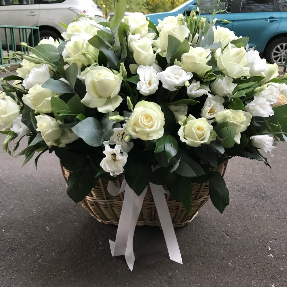На фото - Корзина с цветами №515. В составе данной композиции: Корзина плетеная - 1 шт.; Роза белая 50 см - 30 шт.; эустома белая - 20 шт.; Оазис флористический - 4 шт.; Лента атласная - 4 шт..