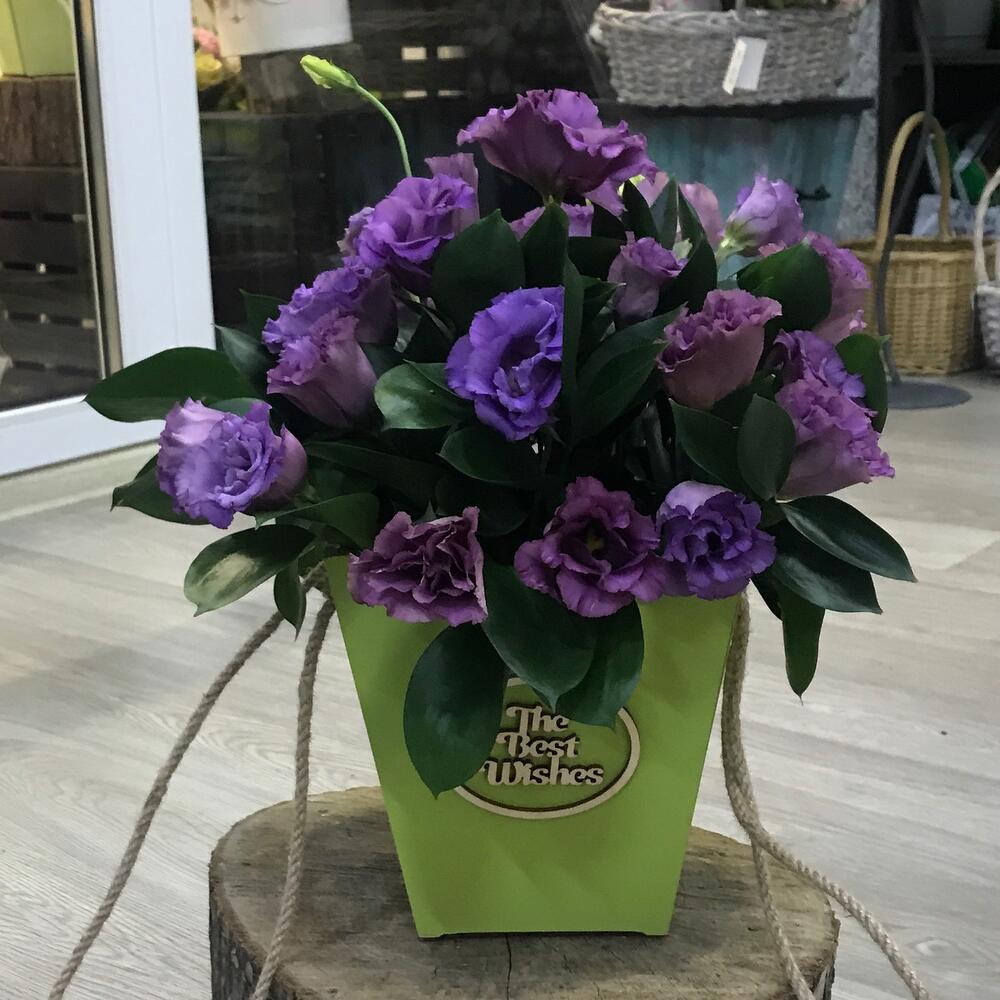 На фото - Букет цветов "Луиза" №169. В составе данной композиции: Эустома - 15 шт.; Рускус - 10 шт.; Кашпо деревянное - 1 шт.; Оазис флористический - 1 шт..
