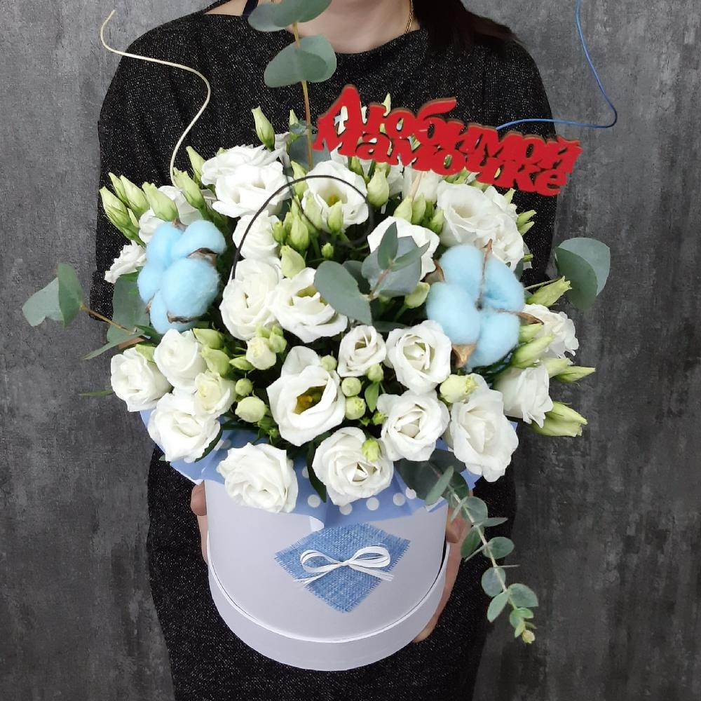 На фото - Букет цветов "Любимой маме" №172. В составе данной композиции: Эустома - 25 шт.; Писташ - 7 шт.; Хлопок - 3 шт.; Ротанг - 3 шт.; Губка оазис - 2 шт.; Декор - 3 шт.; Топпер деревянный - 1 шт.; Эвкалипт - 5 шт.; Шляпная коробка - 1 шт..