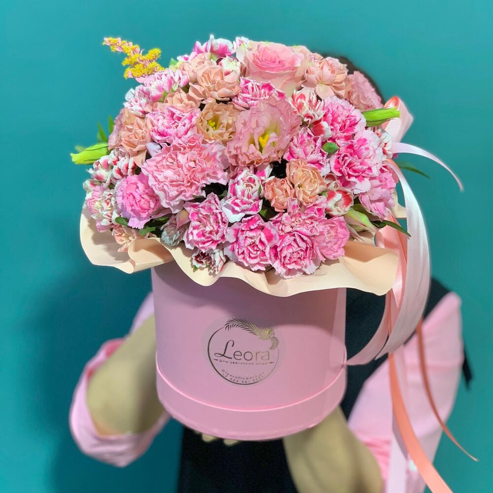 На фото - Букет цветов "Нежность в розовых оттенках для принцессы" №161. В составе данной композиции: кустовые пионовидные розы - 5 шт.; Эустома - 5 шт.; Лагурус - 1 шт.; кустовые диантусы - 5 шт.; Диантус - 5 шт.; Солидаго - 1 шт.; Озотамнус розовый - 5 шт.; Рускус - 5 шт.; Шляпная коробка с лентами - 1 шт.; Писташ - 2 шт..
