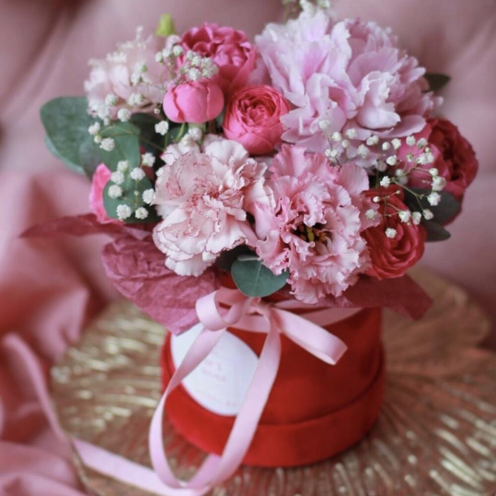 На фото - Букет цветов "Пандора" №161. В составе данной композиции: Пион - 1 шт.; Роза кустовая пионовидная - 2 шт.; Эустома - 2 шт.; Гипсофила - 3 шт.; Эвкалипт - 3 шт.; Коробка - 1 шт.; Лента атласная - 1 шт..
