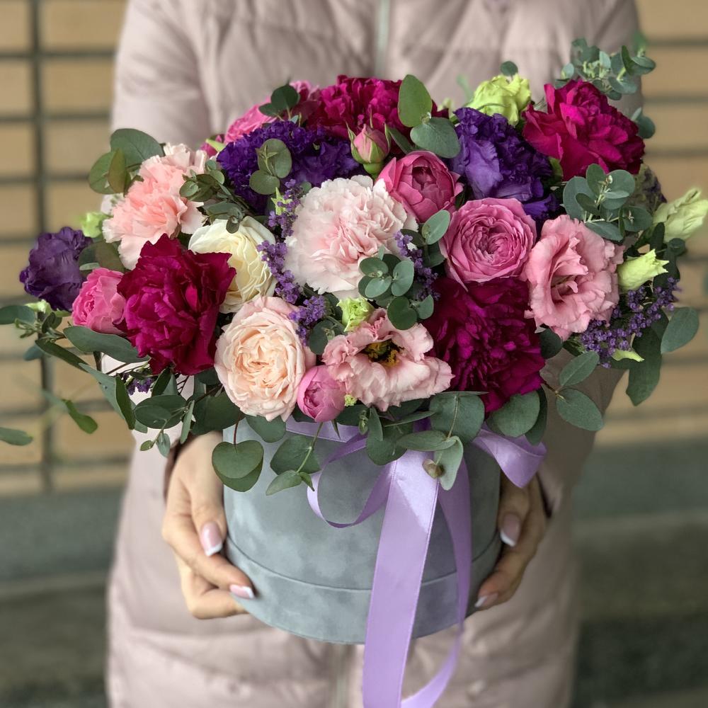 На фото - Букет цветов "Притяжение" №167. В составе данной композиции: Роза кустовая misty bubbles - 3 шт.; Эустома - 3 шт.; Лимониум - 1 шт.; Роза кустовая Бомбастик - 2 шт.; Диантус - 7 шт.; Писташ - 3 шт.; Эвкалипт - 3 шт.; Оазис - 1 шт.; Шляпная коробка - 1 шт..