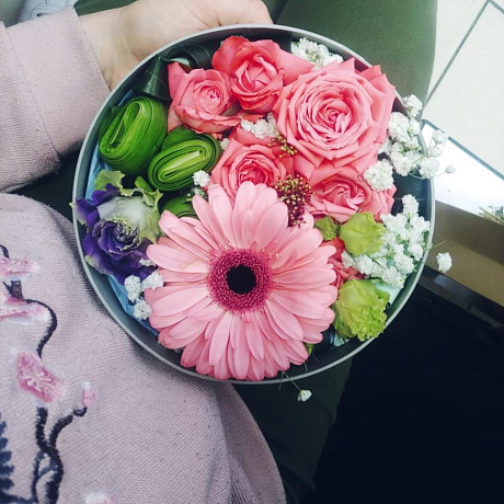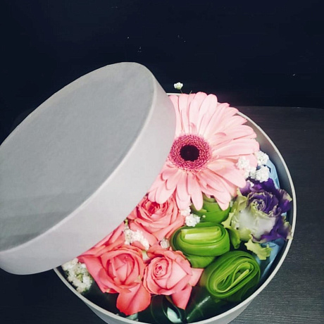 На фото - Шляпная коробка с цветами "Анжелика". В составе данной композиции: эустома махровая - 1 шт.; Роза кустовая - 2 шт.; Гербера - 1 шт.; Скиммия - 1 шт.; Гипсофила - 1 шт.; Оазис флористический - 1 шт.; Коробка шляпная - 1 шт.; Дизайнерское оформление - 1 шт..