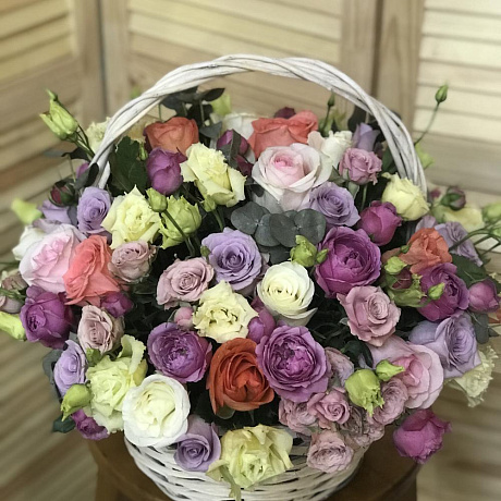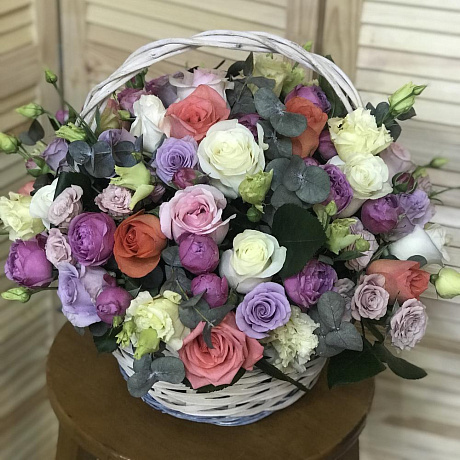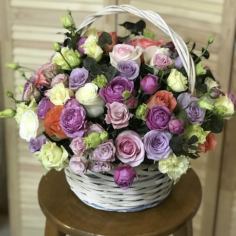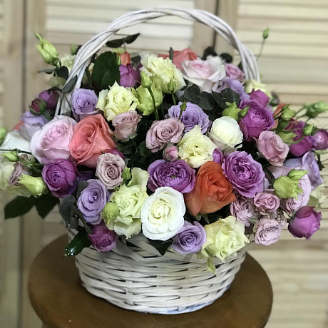 На фото - Букет цветов "Утонченность" №161. В составе данной композиции: Корзина - 1 шт.; Роза кустовая - 15 шт.; Роза - 25 шт.; эустома белая - 10 шт.; Оазис флористический - 2 шт..