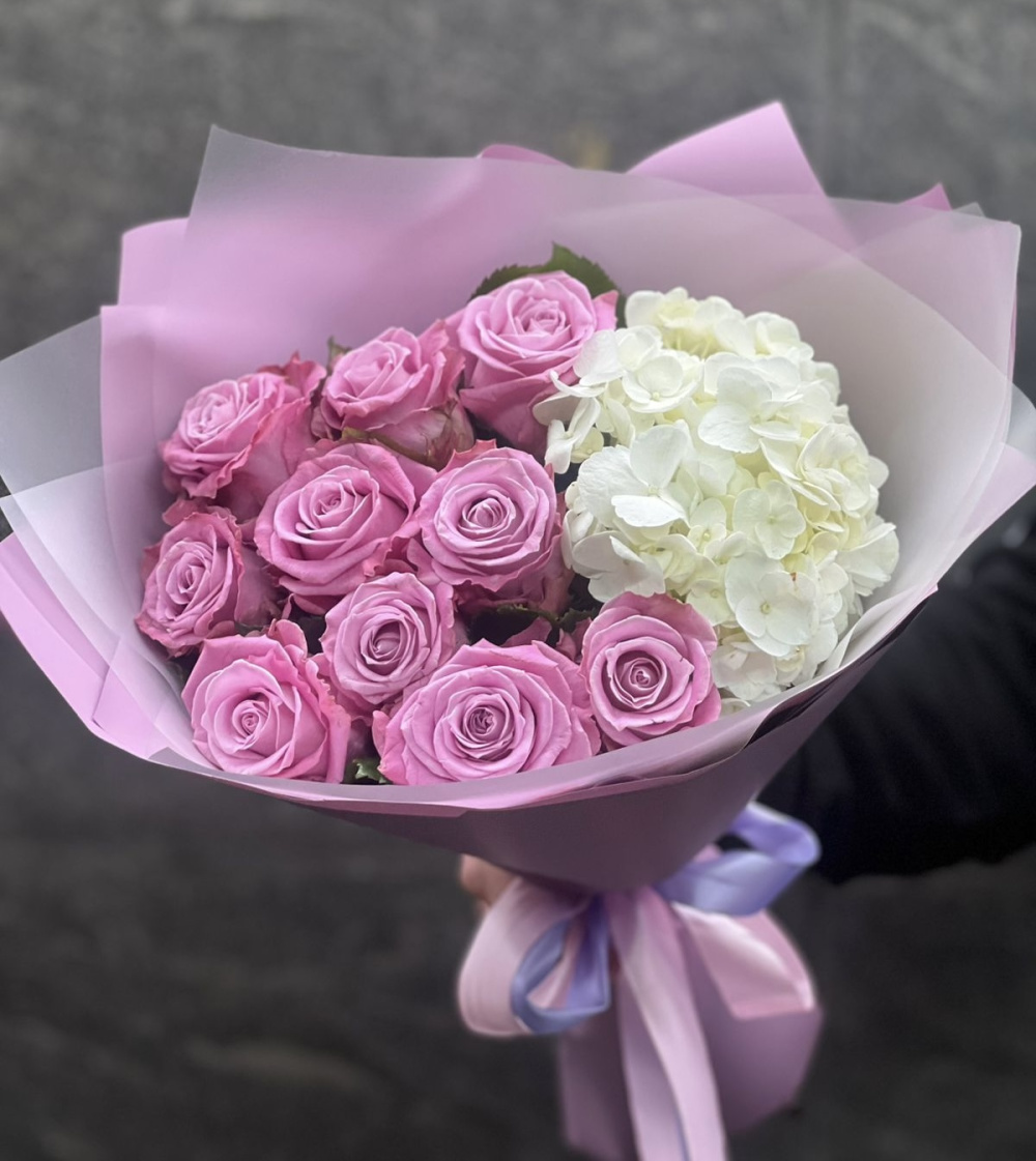 На фото - Букет "Фиолетовый рай". В составе данной композиции: Гортензия - 1 шт.; роза кения 40 см - 10 шт.; Авторская упаковка - 1 шт..