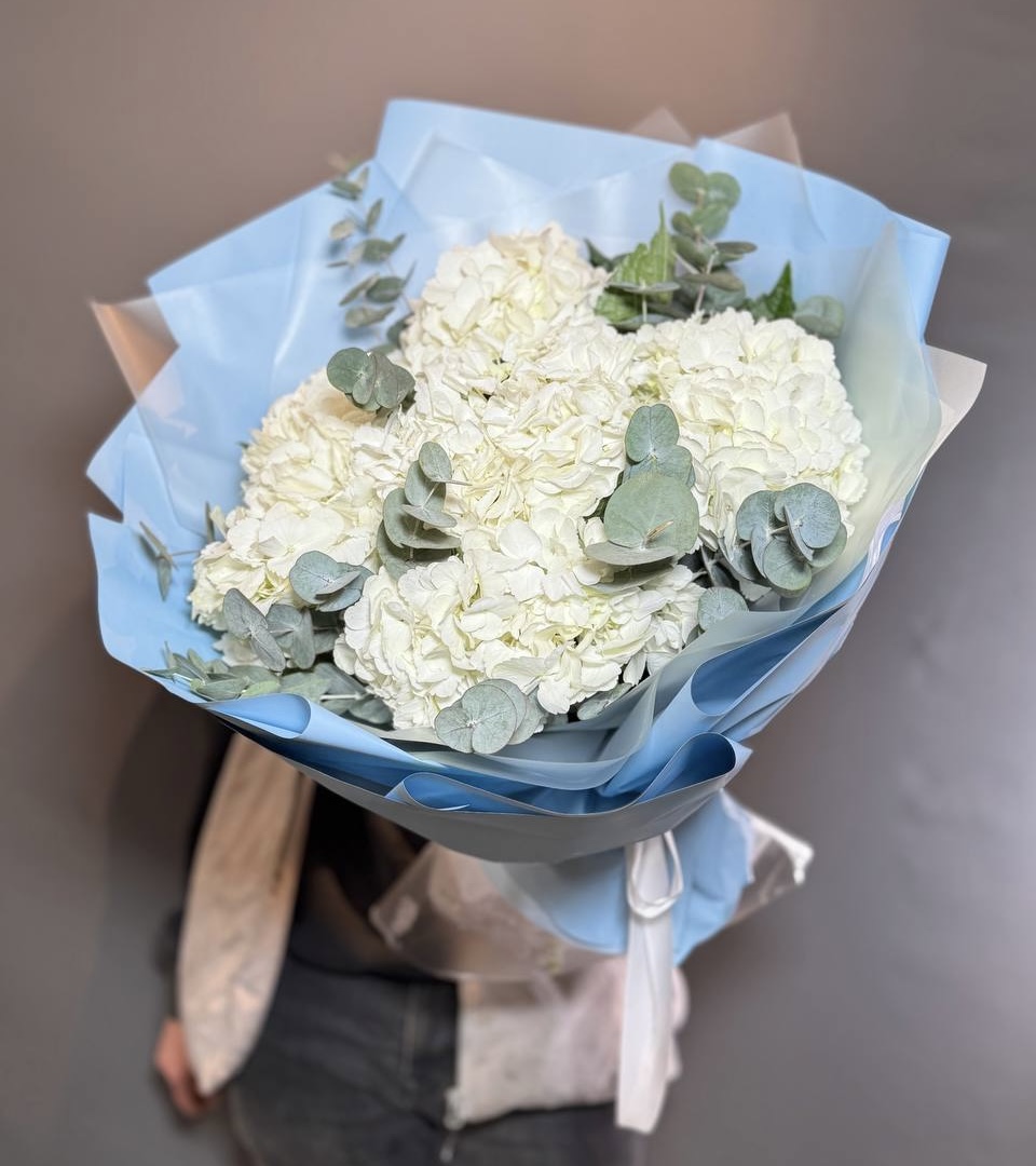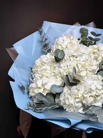На фото - Горделивые Гортензии (5 шт). В составе данной композиции: Гортензия - 5 шт., эвкалипт 0,1.