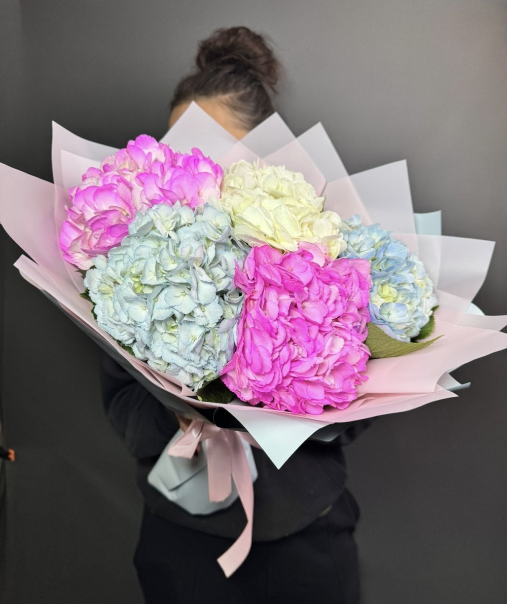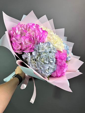 На фото - Гортензия премиум микс. В составе данной композиции: Гортензия - 5 шт.; Лента атласная - 1 шт..