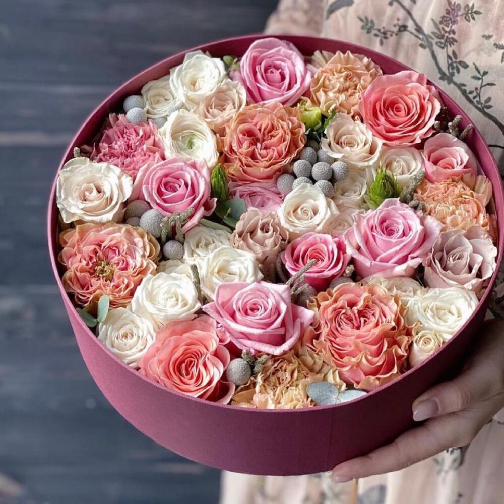 На фото - Букет цветов "Анабель" №162. В составе данной композиции: Роза пионовидная - 4 шт.; Роза - 25 шт.; Гвоздика - 3 шт.; Бруния - 3 шт.; Эвкалипт - 2 шт.; Коробка - 1 шт..