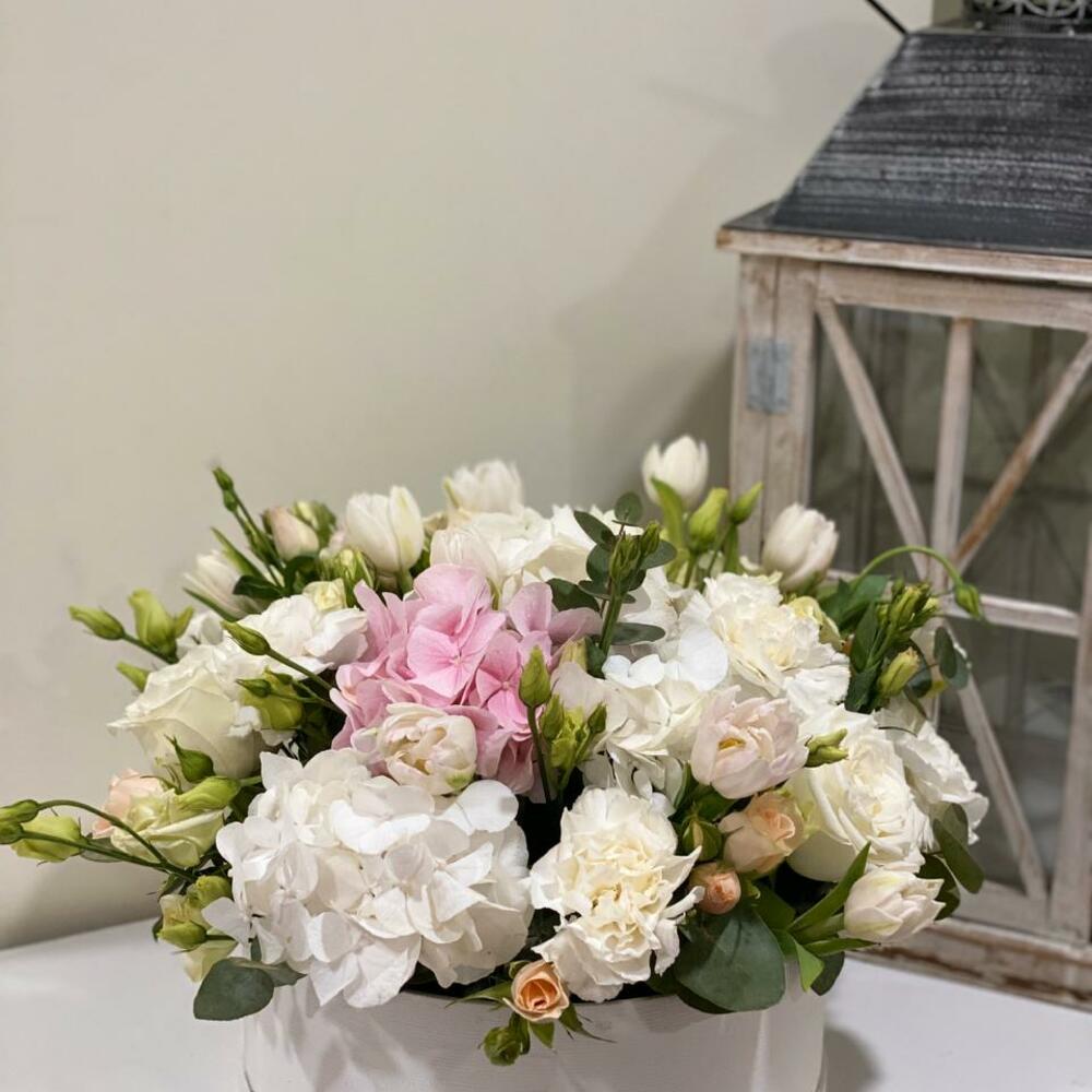На фото - Букет цветов "Ангел" №161. В составе данной композиции: Гортензия - 3 шт.; Гвоздика - 3 шт.; Роза - 5 шт.; Эустома - 6 шт.; Эвкалипт - 5 шт.; Тюльпан - 5 шт.; Роза кустовая - 2 шт.; Коробка - 1 шт..
