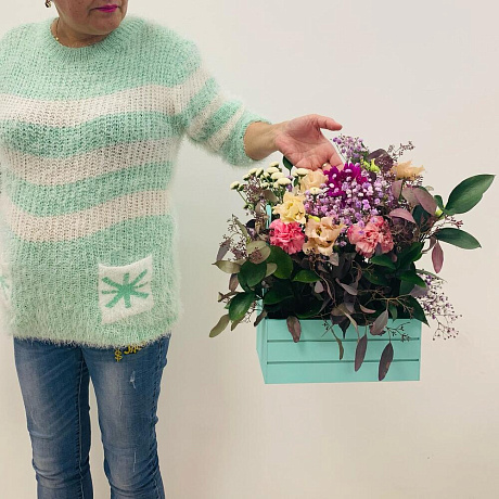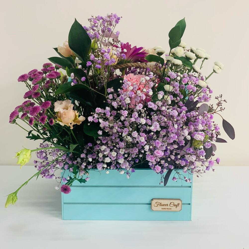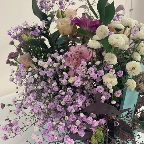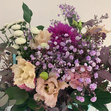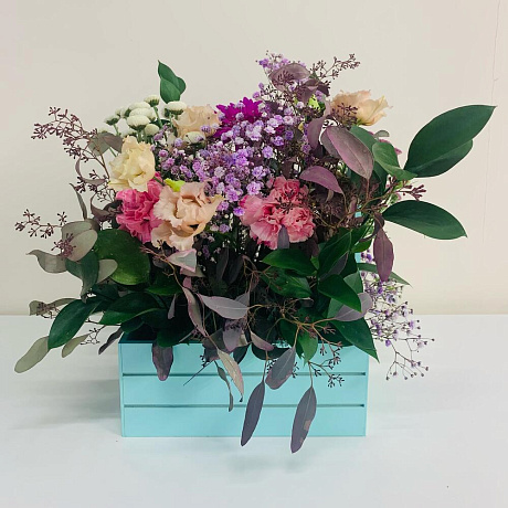 На фото - Букет цветов "Частичка радости". В составе данной композиции: Ящик деревянный - 1 шт.; Эустома - 3 шт.; Эвкалипт Микс - 3 шт.; Гипсофила - 4 шт.; Гвоздика - 3 шт.; Хризантема кустовая - 4 шт.; Рускус - 7 шт..
